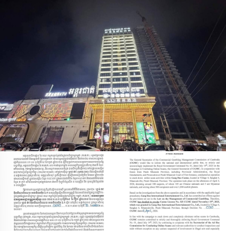 柬埔寨商业博彩委员会总秘书处已于2026年4月6日发布第015/26号新闻稿(C.C.G.C.P.R.),正式宣布撤销西港港岛赌场(Gandaw赌场)的营业执照。 🚫